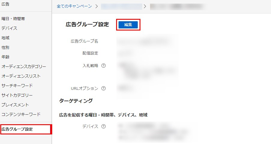 左メニューより「広告グループ設定」を選択します。広告グループ設定画面を開き、「編集」をクリックします。