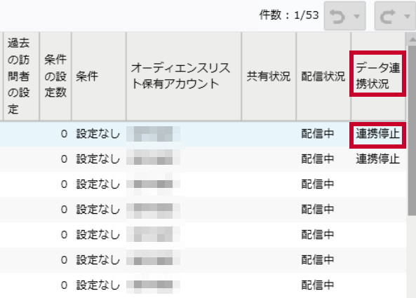表示されたオーディエンスリストのうち、列「データ連携状況」に「連携停止」と表示されているリストが、データ連携が停止中のオーディエンスリストになります。