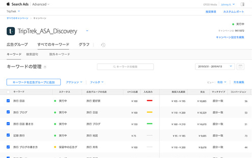 キーワード単位で最大タップ単価(最大CPT)やマッチタイプを設定しなかった場合は広告グループで設定した値が適応されます。獲得確度の高いキーワードは最大タップ単価(最大CPT)を高めに設定し他のキーワードとの入札の傾斜をつけることで配信の強弱をコントロールすることも可能になります。
