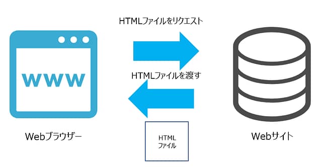 WebブラウザはWebサイトにアクセスするとき、Webサイトを管理しているサーバーに表示する内容のファイル(HTMLファイル)の表示をリクエストし、サーバーは、それをブラウザに渡します。そのHTMLファイルをブラウザが読み取って私たちがWebページを見ることができるようになっています。