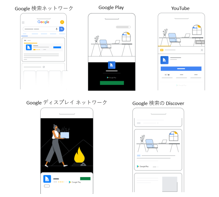 アプリキャンペーンでは、Google検索、Google Play、YouTubeといったGoogleの主要サービスでアプリを宣伝できます。