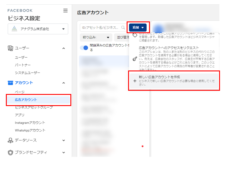 [広告アカウント]を選択します。[追加]をクリックし、[新しい広告アカウントを作成]を選択します。