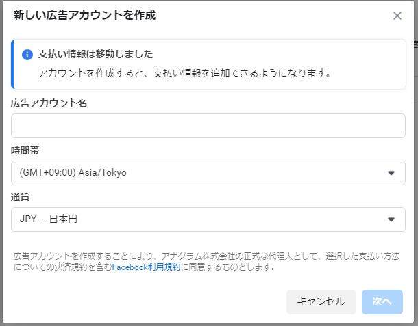 任意の広告アカウント名を入力し、[次へ]をクリックします。