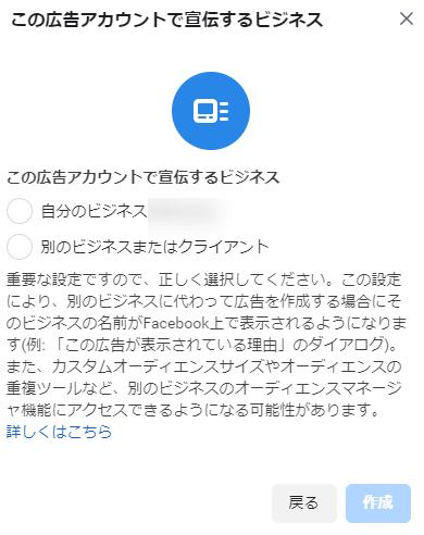 この広告アカウントで宣伝するビジネスを選択します。たとえば、新たに自社でInstagram広告の配信をスタートしたい場合は[自分のビジネス]を選択し[作成]をクリックします。