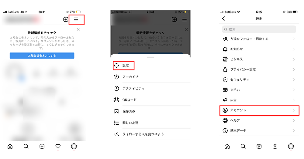 自身のInstagramアカウントのプロフィールタブをクリックし、右上メニューから[設定]、[アカウント]と進みます。