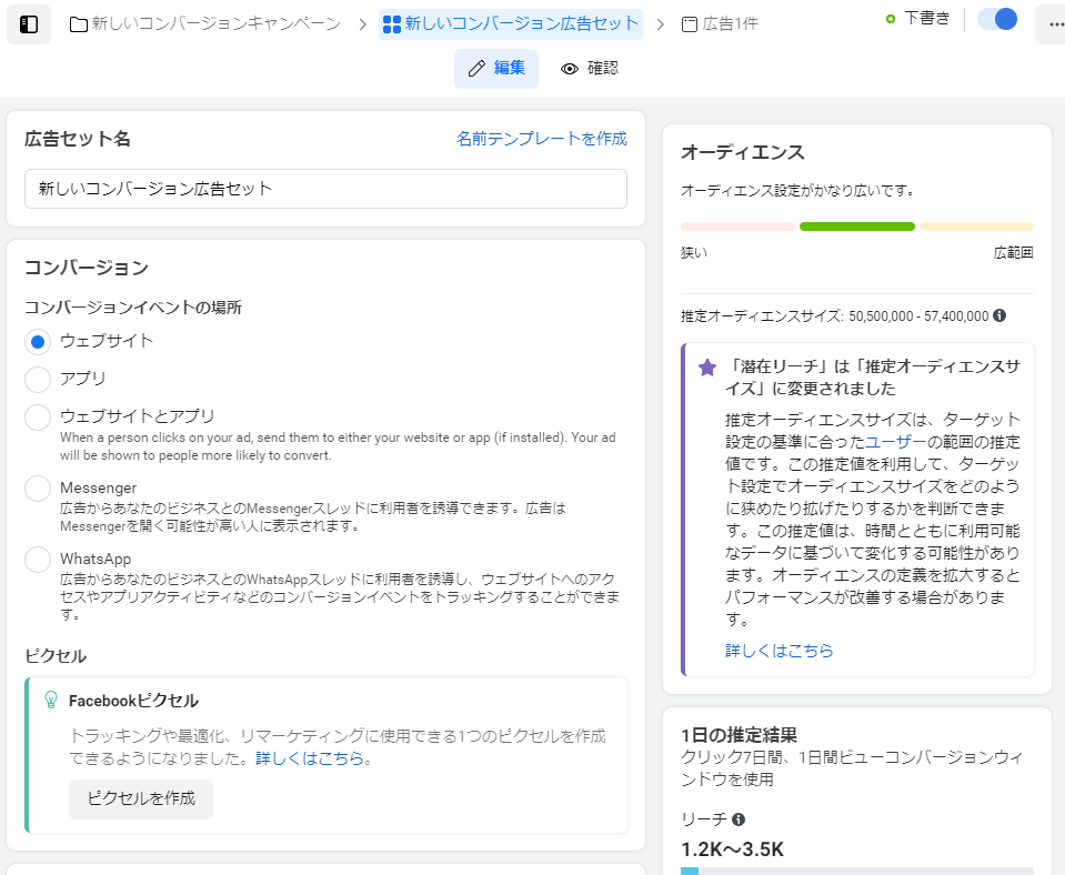 次に広告セットの設定を行います。広告セットでは、オーディエンスや配置の設定などを設定します。