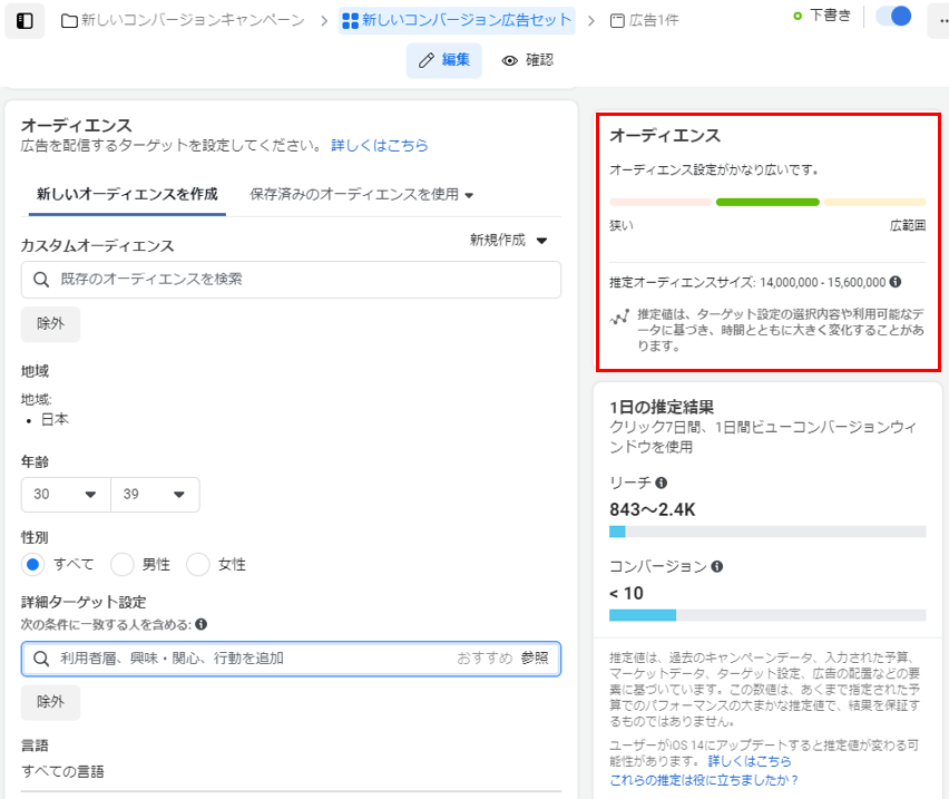 仮に潜在リーチが1,000人で、クリック率が5%、コンバージョン率が1%だとすると1件のコンバージョンを獲得できるかさえ不安な配信ボリュームです。継続的に獲得したいコンバージョン数が多いほど相応の潜在リーチも必要になりますので、目標のコンバージョン数や想定のクリック率、コンバージョン率からどの程度の潜在リーチが必要か逆算し、必要な潜在リーチが確保できる範囲でターゲットの絞り込みを行うと良いでしょう。