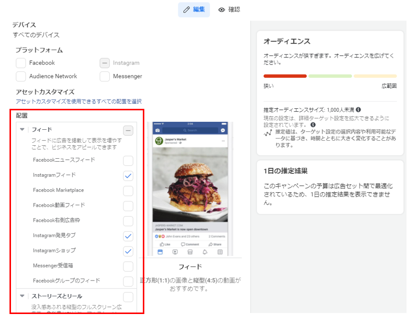 配置は、「自動配置」と「手動配置」が選択可能ですが、Instagramにのみ配信をしたい場合は「手動配置」を選択し、Instagramと入っている配置にチェックを入れることでInstagramにのみ配信できます。Instagramの掲載箇所は以下です。
