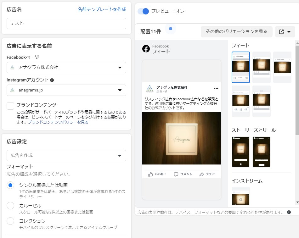 ニュースフィード面やストーリーズ面など配置ごとに異なるクリエイティブを配信したい場合は、「配置ごとのアセットカスタマイズ」機能を利用することで配置ごとに訴求を変えるだけでなくURLやパラメータも個別に設定が可能です。