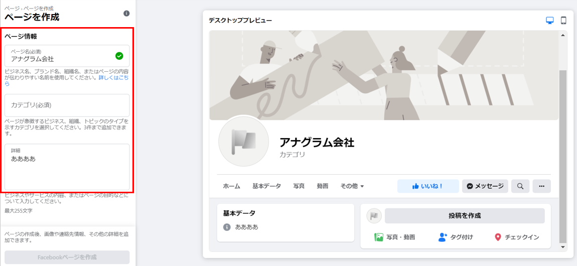 こちらからFacebookページを作成します。ページの名前、カテゴリは入力が必須項目で、説明は任意項目です。