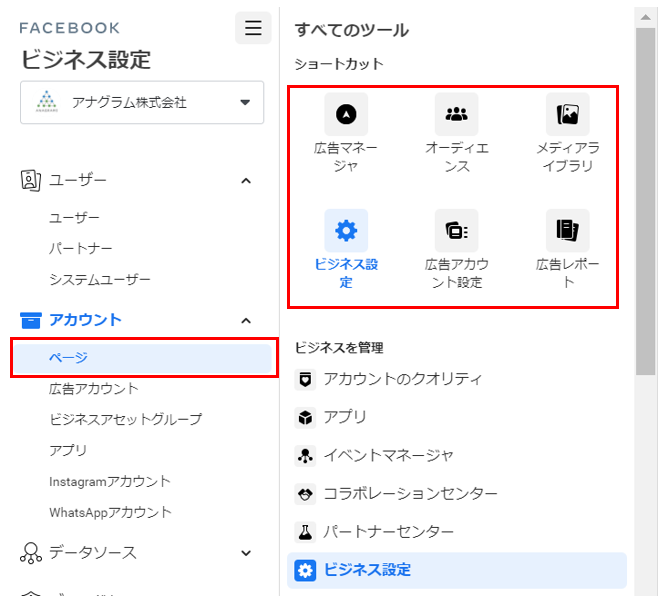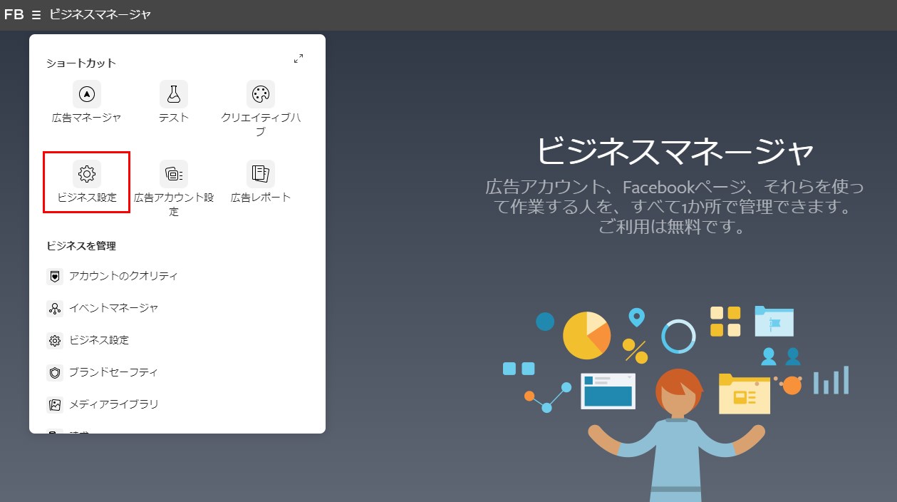 Facebookビジネスマネージャを開きます。メニューをクリックして次に[ビジネス設定]を選択します。