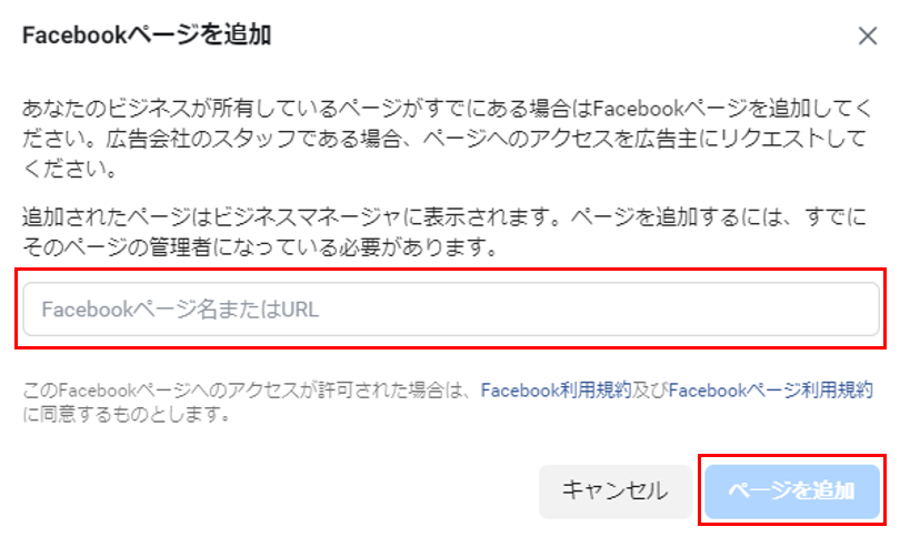 作成したFacebookページ名またはURLを入れて[ページを追加]をクリックします。
