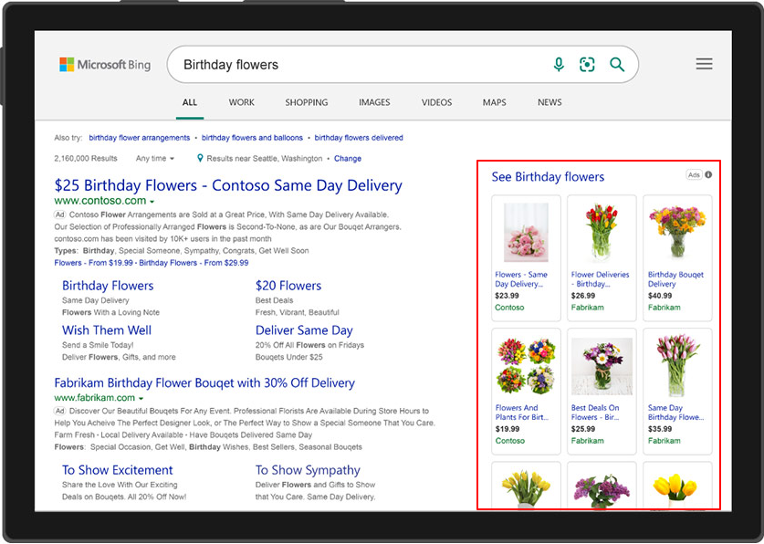 現在、Bingの検索結果にはMicrosoft広告とYahoo!広告との両方からテキスト広告を配信できます。一方で、Yahoo!広告にはショッピング広告がなく、Bingの検索結果にショッピング広告を配信できるのはMicrosoft広告からのみとなっています。