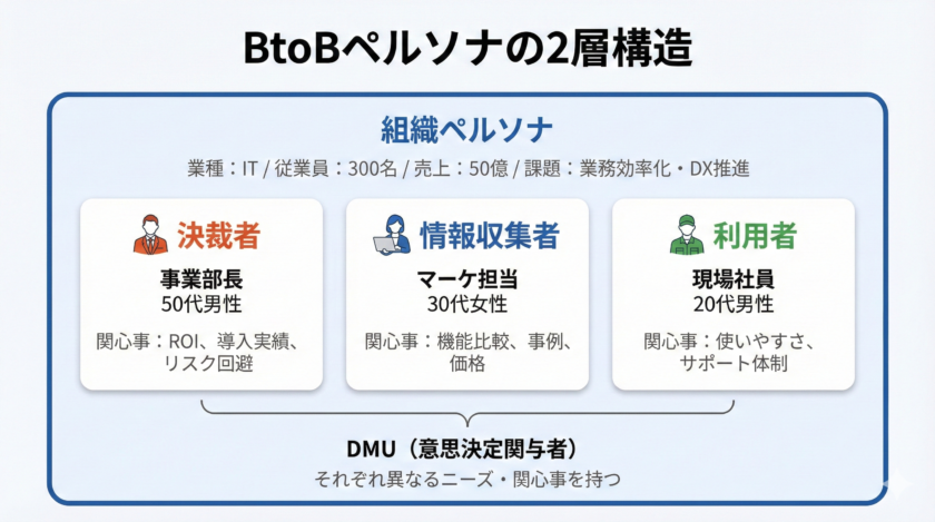 さらに、BtoBではDMU(Decision Making Unit:意思決定関与者)を意識する必要があります。実際にサービスを使う「利用者」、導入を検討する「情報収集者」、予算を承認する「決裁者」など、購買プロセスに関わる複数の人物像を設定することで、より実態に即したマーケティングが可能になります。
