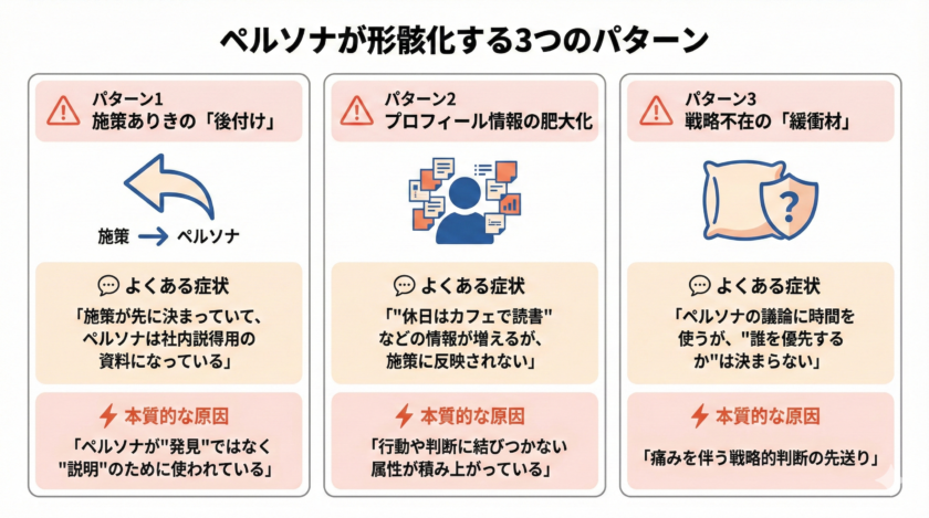 なぜ、ペルソナは形骸化してしまうのでしょうか。その原因を3つのパターンに整理してみます。