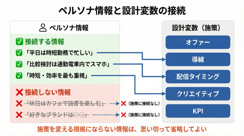 たとえば、「休日はカフェで読書」という情報は、「だから日曜の午後にSNS広告を配信する」「だから落ち着いたトーンのクリエイティブにする」といった施策に接続できるなら意味があります。接続できないなら、その設定は省略しても問題ありません。