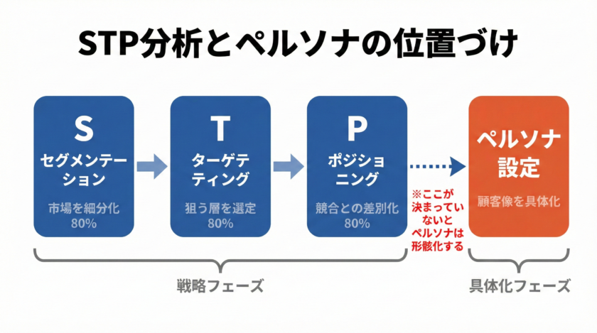 STP分析で「誰に、何を、どう届けるか」の方向性を定めてから、ペルソナを設定する。戦略が曖昧なままペルソナを作っても、形骸化するだけです。