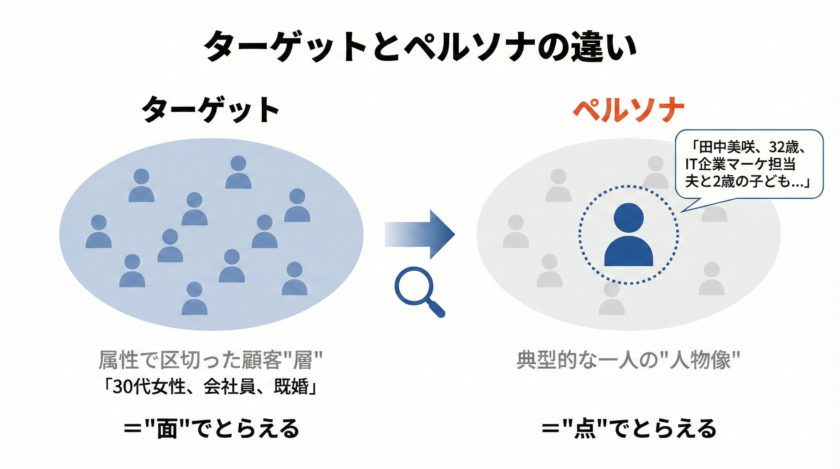 ペルソナとよく混同されるのが「ターゲット」です。両者は似ているようで、その粒度と役割が異なります。