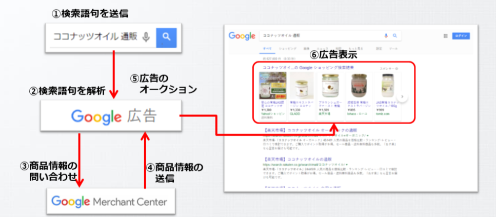 ユーザーがGoogleで検索すると、Google 広告のシステムが検索語句を解析し、検索語句に関連する商品データをGoogle Merchant Centerから取得します。