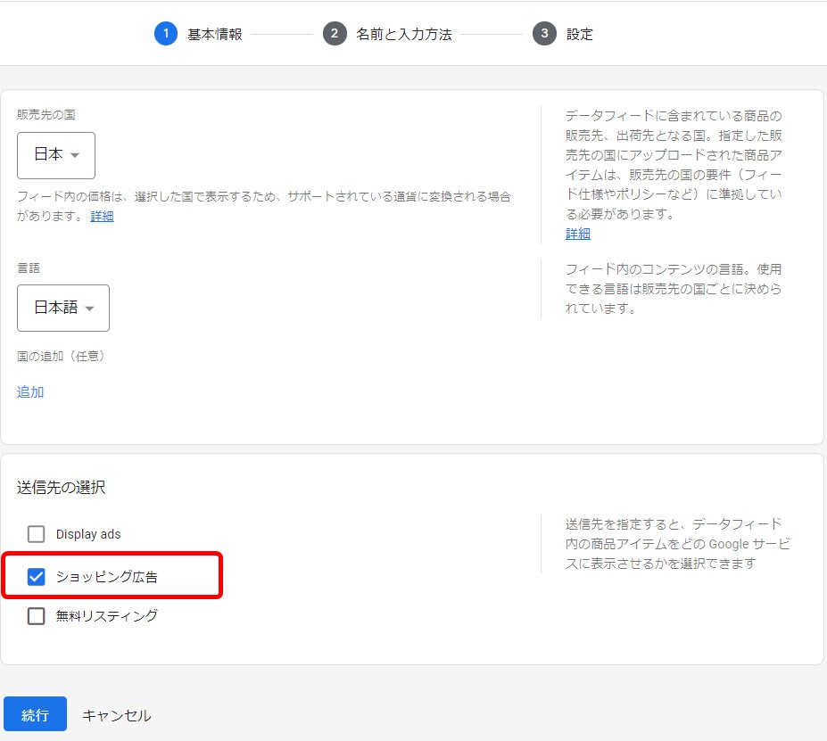 いずれかを選択したら、送信先に「ショッピング広告」を含めて次のフィード作成に進みます。