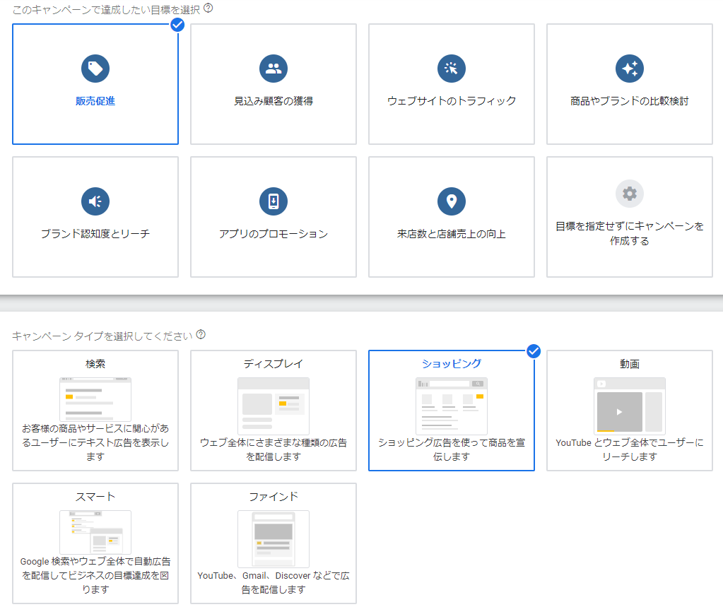 キャンペーンの目標は、ショッピング広告が使用できる「販売促進」「見込み顧客の獲得」「ウェブサイトのトラフィック」のいずれかを選択します。