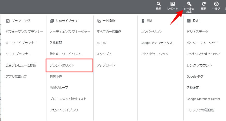 広告管理画面左メニューの「ツール」から「共有ライブラリ」を選択し「ブランドのリスト」を選択します。