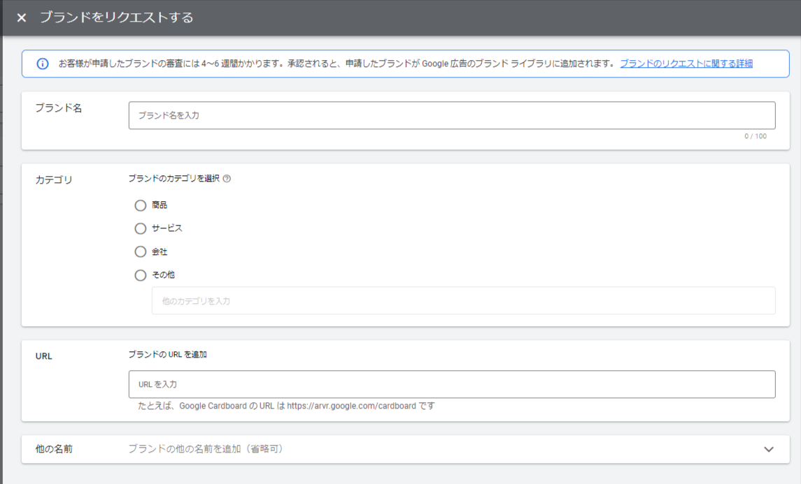 ブランド名やカテゴリ、URLなどを入力してリクエストを送信すれば完了です。その後、4~6週間の審査を経て承認されれば、選択が可能になります。