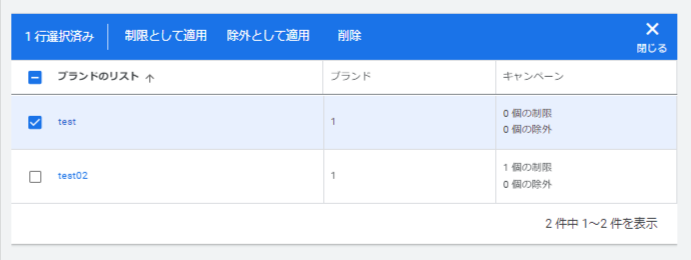 共有ライブラリで「ブランドのリスト」を選択し、適用したいブランドのリストにチェックを入れます。「除外として適用」から対象のキャンペーンを選択して適用が可能です。