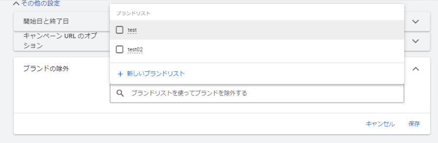 キャンペーン設定の「ブランドの除外」より作成済みのブランドリストを選択する、あるいは新しいブランドリストの作成ができます。