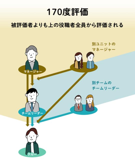 170度評価とは、被評価者よりも上の役職者全員が評価に関与する仕組みです。被評価者と同等あるいは下のメンバーは評価に関与しないため、360度や180度ではなく170度としています。
