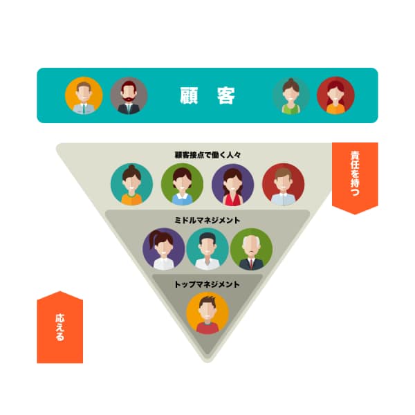 さらに、逆ピラミッド構造という考え方を採用し、経営層・管理職が現場を支援する体制を整えています。これにより、上位の判断を仰いでスピードが遅れるといった事態を回避し、現場が即時に動けることを優先しています。