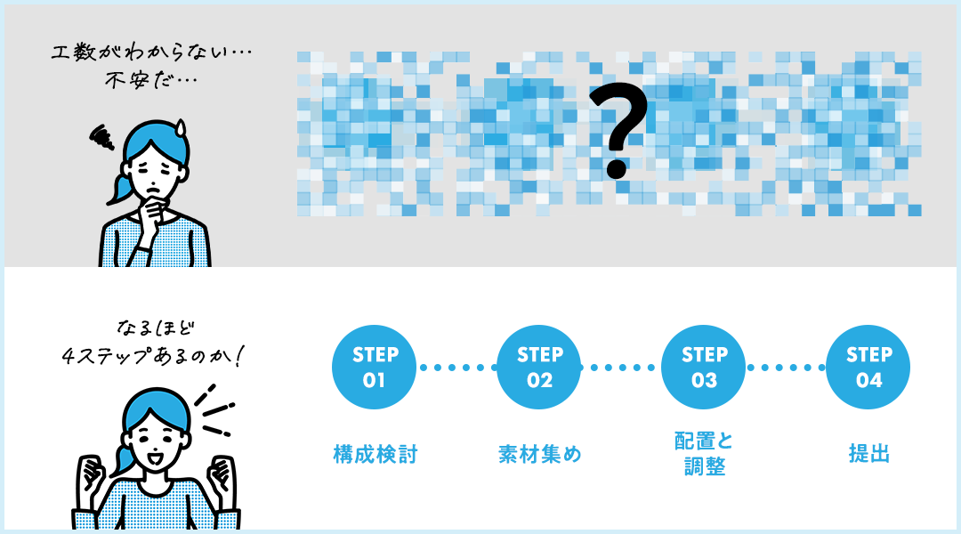 たとえば初めて動画を制作することになった場合、構成・素材集め・編集・提出と4ステップに分けて、それぞれ必要なタスクを洗い出します。