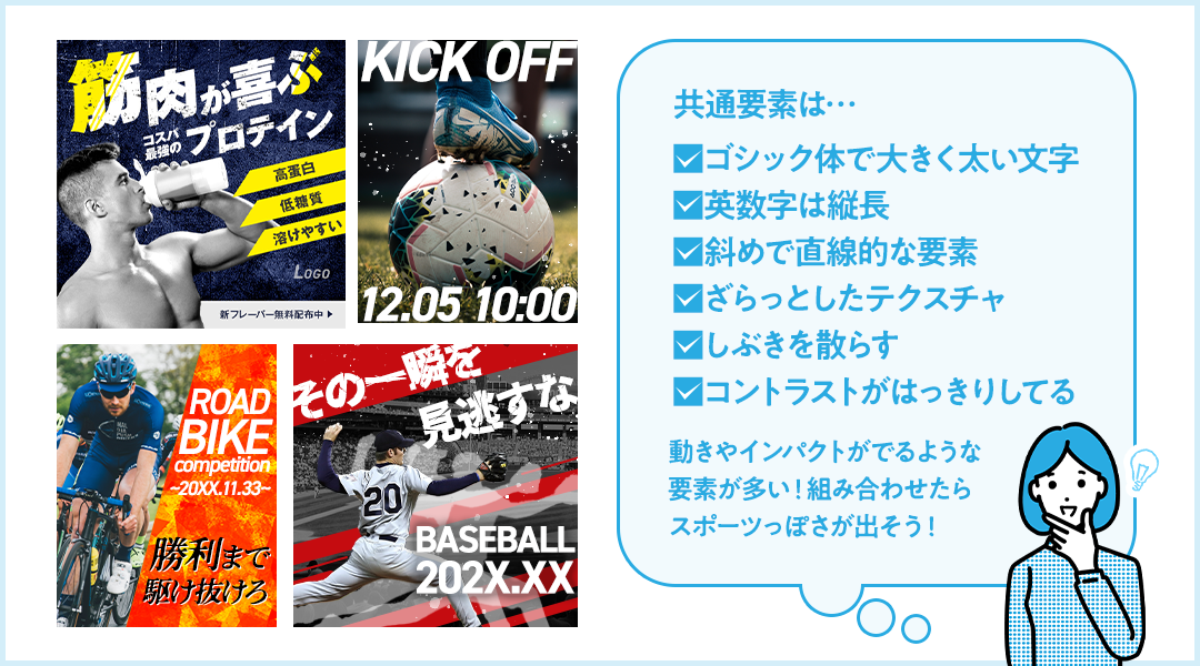 たとえばスポーツ系の商材を扱ったバナーを制作したい場合は、以下のように共通要素を言語化してみましょう。