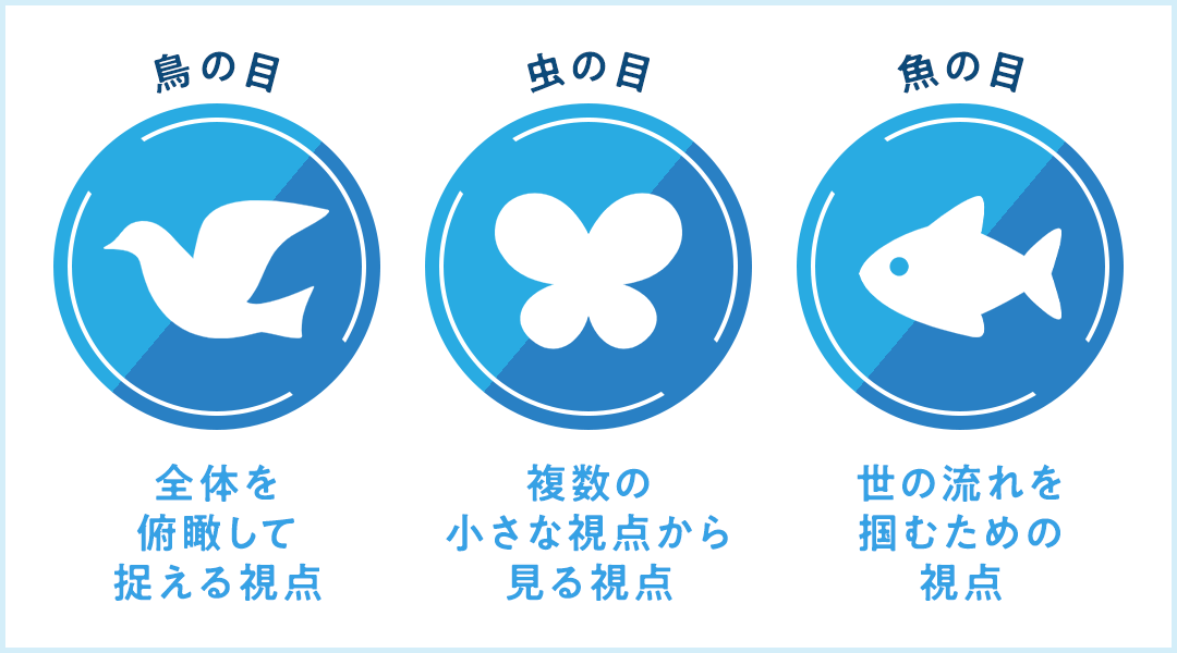 このフレームワークは「鳥の目」で全体のバランス感を考慮し、「虫の目」で細部のディテールに注目し、「魚の目」で流行など時間や業界の流れを捉えるといった方法です。