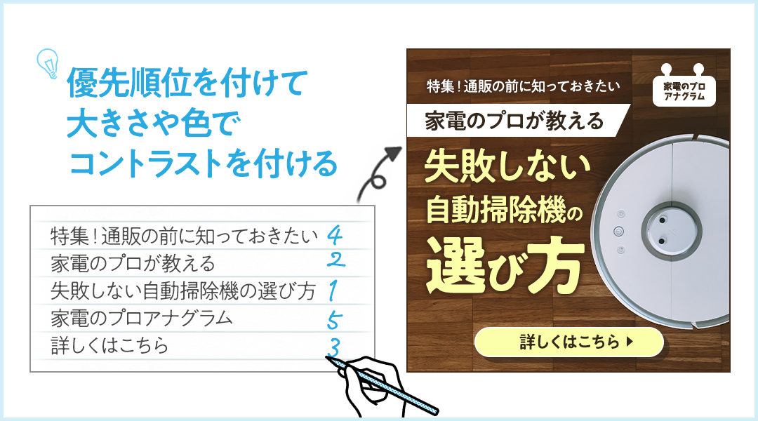 どの要素が一番伝えたいポイントなのか、明確にしましょう。
