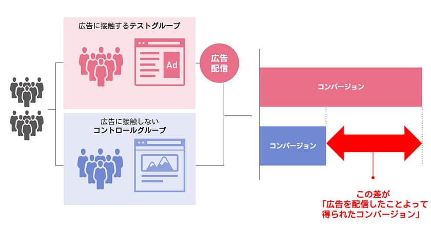 コンバージョンリフト調査では、「広告接触群」と「非接触群」の行動を比較することで、広告の影響を数値で可視化できます。