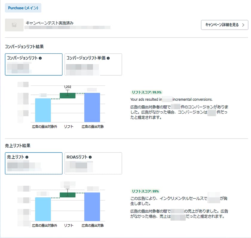 たとえばMeta広告では、広告に接触したユーザーと、接触していないユーザーを比較することで、全体のリフト値が可視化されます。これにより、広告がユーザーの「行動変容」にどれだけ寄与したかが明確になります。
