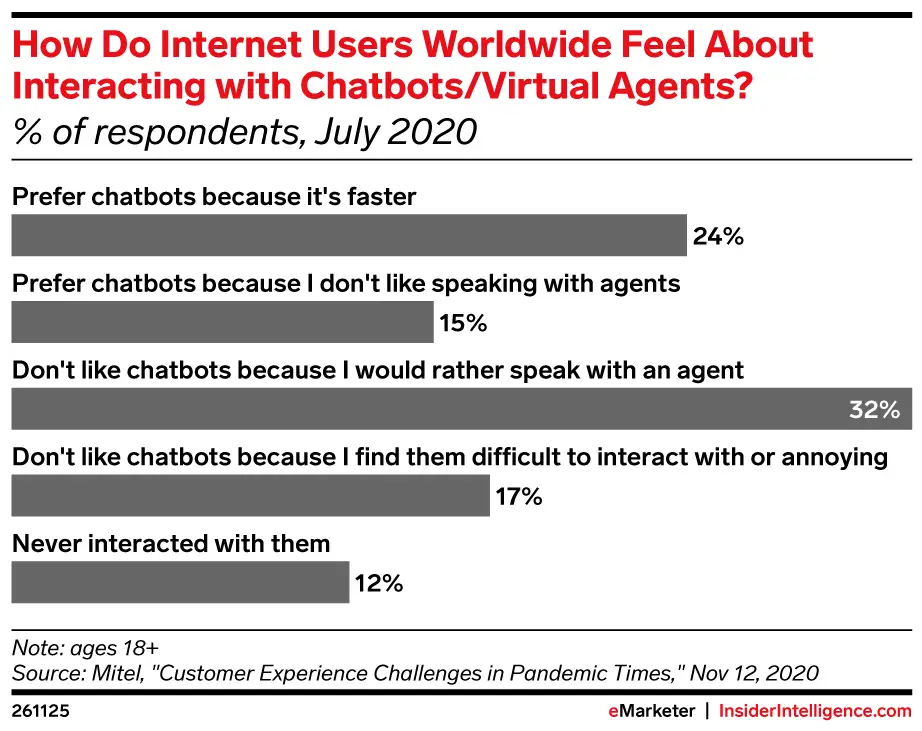 カナダの通信会社Mitelが実施した調査では、合計39%の回答者(チャットボットの方が速いから:24%、対応係の人間と話すのが苦手だから:15%)がチャットボットに対してポジティブな感情を抱いていると回答しましたが、半数弱の回答者はチャットボットとのやり取りが好きではないと回答しています。