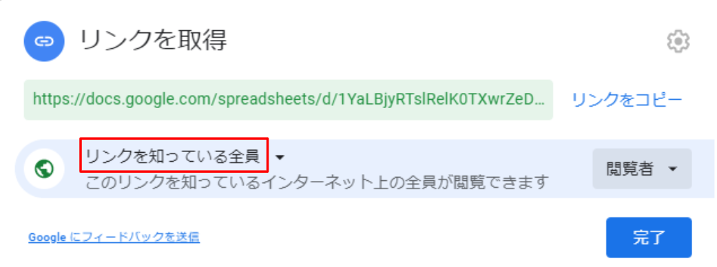※スプレッドシートのURLを共有する際は管理権限を「リンクを知っている全員」に変更します。