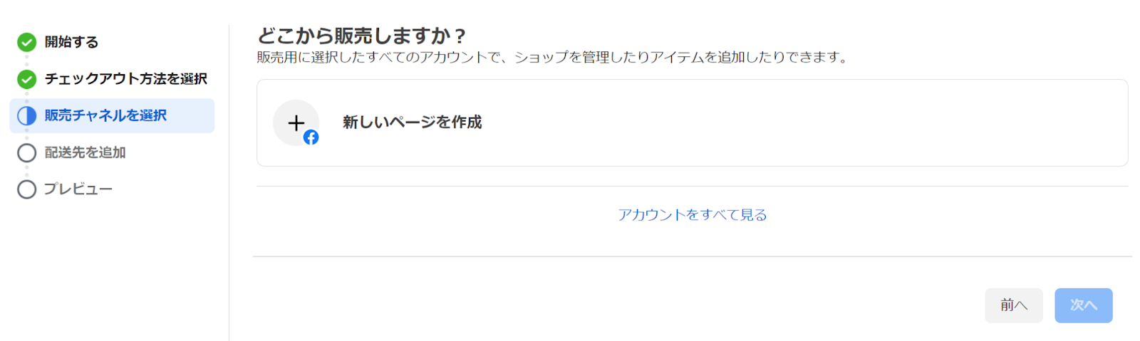 4.販売を行うFacebookのビジネスページを選択し「次へ」をクリックします。