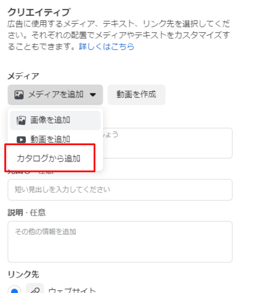 1.広告マネージャーから新しい広告をを作成し、メディアの項目から「メディアを追加」を選択し、その中の「カタログから追加」を選択します。