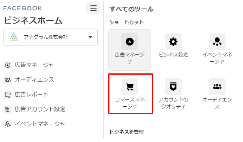 1.ビジネスマネージャーにログインし、「すべてのツール」内から「コマースマネージャー」を開きます。