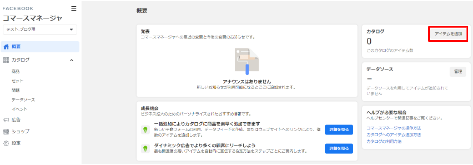では次に、作成したカタログにアイテム(商品情報)を追加していきましょう。