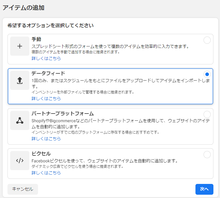 他のプラットフォームでアイテムを管理していない場合、基本的にはデータフィードでアイテムを追加することをおすすめします。