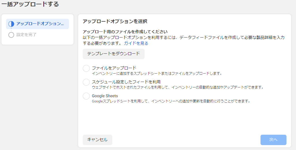 ※Eコマースのみ:カタログにアイテムを追加する方法の選択画面が表示されますので、「商品情報をアップロードする」を選択します。