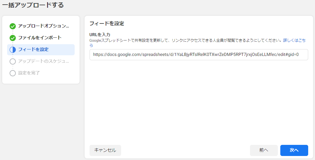 4.まとめたデータフィードのスプレッドシートURLを入力し、アップロードを行います。