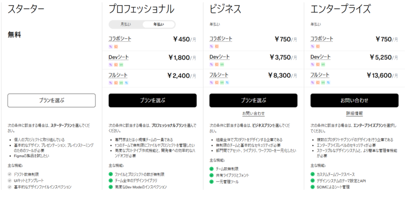 有料プランは、個人や小規模チーム向けの「プロフェッショナル」、大規模な組織向けの「ビジネス」「エンタープライズ」があります。
