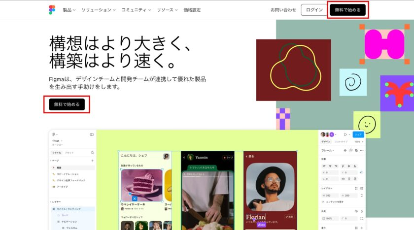 Figma公式サイトの「無料で始める」ボタンを選択し、ユーザー登録を行います。