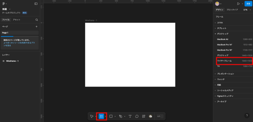 ②画面右のメニューから、デバイスサイズを選択して挿入する(今回はPC向けなので横幅が1440pxの「ワイヤーフレーム」を選択)