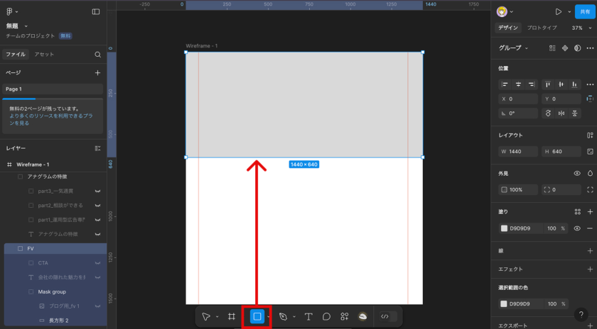 人によっては、ワイヤーフレーム用のファイルとデザイン用のファイルを分けて作成したり、別々のフレームで管理するケースもありますが、作業しやすい方法でOKです。今回は、先ほど作ったワイヤーフレームを整えていく形で進めていきます。